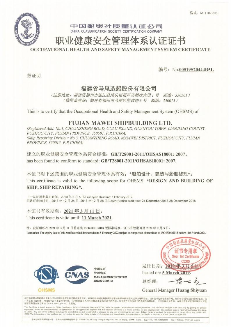 职业健康安全管理体系认证证书